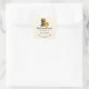 Business stickers with a cute image. A girl in a crocheted bee costume with a bee by her side. Watching over a jar of honey.