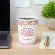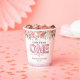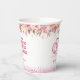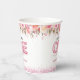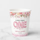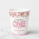 Modern girl 1st birthday party paper cups featuring a simple white background, sparkle glitter & confetti, pretty pink watercolor florals, the saying "little miss one-derful", your childs name, and the date of the party.