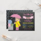 Amaze your guests with this cute rain theme birthday invitation featuring a cute girl holding a pink umbrella with vibrant typography against a chalkboard background. Simply add your event details on this easy-to-use template to make it a one-of-a-kind invitation. Flip the card over to reveal a rain drops pattern on the back of the card.
