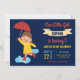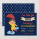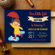 Amaze your guests with this cute rain theme birthday invitation featuring a cute girl holding an orange umbrella with vibrant typography against a dark blue background. Simply add your event details on this easy-to-use template to make it a one-of-a-kind invitation. Flip the card over to reveal a rain drops pattern on the back of the card.