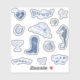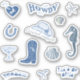 Playful pattern in blue white tones featuring coastal / cowgirl elements (cowgirl boot, hat, horseshoe, horse, stars, bows, cherries, seahorse, starfish, shell, howdy, yeehaw typography) as coastal / beach party / event for bachelorette, bridal shower, birthday party, graduation party etc.