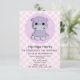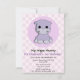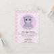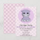 This girl's birthday invitation card shows a cute baby hippo cartoon on a purple pink geometric background.