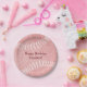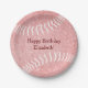These fun softball birthday party paper plates feature a minimalist softball graphic (represented by the softball's stitches in white) overlying a chic, pink digitally created texture, upon which you can customise the text in any custom colour - by katz_d_zynes