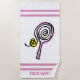 Cute girly pink tennis racket design custom beach towel. Personalised beachtowel with athletic stripes and typography. Add your own funny quote, name or monogram letters. Cool Birthday gift idea for teen children, girl, mum, sister, wife, aunt, grandma, cousin, friend, sports coach, fitness instructor, tennis player, trainer etc. Fun summer accessories for beach or pool. Sporty design with customisable background colour. Artsy tennis racket and ball design.