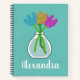Add your name to this cute and pretty sketchbook to make it your own. Three flowers in blue, gold, and pink with a glitter effect in a vase with water are featured in the design.