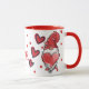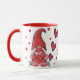 This is an adorable mug to gift someone for valentine's day. This design features a cute gnome woman and man holding a heart in their hands with a dot and heart pattern and the word love on the front of the mug.