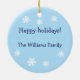 This adorable ornament has three cute gnomes and snowflakes in lovely blue, gold and white colours and a buffalo plaid design (gold colours are simulated and have no actual metallic gold). It says "Gnome for the holidays!" The item can be personalised with the year on the front, and a name or names on the back. The back says "Happy holidays! and has a blue background with white snowflakes.