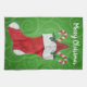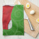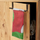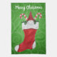 This kitchen hand towel is green with lighter green swirls and a red and white Christmas stocking that has a gnome and candy canes in the top between green holly leaves. Customise the Merry Christmas text with the template.