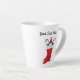 This Latte mug has a cute gnome wearing a pointy dark red hat inside a red and white Christmas stocking with holly leaves and two candy canes. Customise your text with the template.