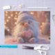 A charming gnome with a soft white beard sits on a plush pink rug. He holds a heart-shaped cookie close to his chest, and his eyes sparkle with a gentle light. The background is filled with soft, warm lights that create a cozy and inviting atmosphere. This design is perfect for anyone who loves cute characters, enjoys heartwarming imagery, or needs a touch of winter magic in their life.