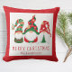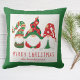 Cute personalised holiday red and green reversible throw pillow featuring three funny Scandinavian-style gnomes with a seasonal red and green hats. You can easily personalise the "Merry Christmas" greeting and your name at the bottom or leave blank.