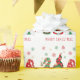 Cute holiday wrapping paper featuring three Scandinavian-style gnomes with a seasonal red and green hats and tunics under red, green and gold snowflakes. Personalise the "Merry Christmas" greeting (e.g., "Happy Holidays") in fun red typography.