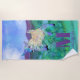 Personalise this colourful cute baby goat jumping by adding a monogram name and initial to this fun beach towel. Adorable jumping baby pigmy goat colourful watercolor illustration for goat lovers to enjoy. Ideal for animal lovers. Baby goat jumping in teal, blue, purple and yellow with a countryside landscape background. Original artwork by artist Catherine Sweetman