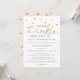 Adorable and cute baby shower invitation features sprinkled stars along the top and the word "twinkle" in gold with modern serif typography. The back of the invitation is blush pink with sprinkled gold stars.