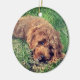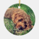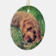 A ceramic ornament with a cute image of a Golden Doodle. The background, image and text can be personalized. Original artwork by W.B.