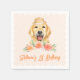 Add a cute accent to your event's tablescape with these customisable paper napkins. It features watercolor illustrations of cute golden retriever and peach flowers. Personalise by adding your details. These golden retriever paper napkins are perfect for birthdays, baby showers, and other events.