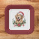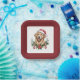 These Golden Retriever Christmas paper plates are the perfect addition to any family dinner. This design is complete with an adorably cute golden retriever watercolor graphic. The golden retriever dog is wearing a Santa hat and is surrounded by various Christmas decorations like poinsettias and Christmas ornaments. The background colour is red.