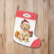 The front of this Holiday stocking shows an image of an adorable Golden Retriever puppy wearing a Santa hat. Behind him are brightly wrapped Christmas gifts. The image is placed on a white background, and the toe and top border are a red and white snowflake pattern. On the top border is a white label with your custom text. The back of the stocking is the same red and white snowflake pattern.