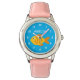 Cute goldfish kid's watch gift with custom name or monogram letters. Cute sea life animal mascot clock design for little kids to keep time. Best Christmas and Birthday party gift ideas for children. Make one for daughter, granddaughter, son, grandson, new baby, grandchild etc. Funny gold fish cartoon illustration for children. Girly pink, blue or other colour leather band.
