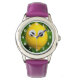 The watch looks exactly as depicted. I was especially pleased with the watch band, which is a nice quality, supple leather. I point this out because an option, which was sold out, was with a multi-colored but clearly plastic band. This is the better choice, in my view.