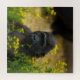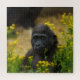 A cute baby gorilla sitting in a field of yellow flowers. His gorgeous eyes looking towards you.