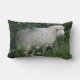 This awesome pillow features a photograph of a cute fluffy sheep. The sheep is surrounded by wild flowers and long grass and is greedily eating some leaves. It has a thick white coat of wool and a cute black nose.