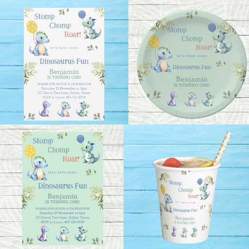 Celebrate a Cute Dinosaur 1st Birthday Party for your precious baby boy with this adorable paper cup! Perfect for a first birthday, this personalised cup features cute dinosaurs in soft blues and greens holding joyful polka dot blue and yellow balloons. With playful phrases like "stomp chomp roar" and "dinosaurus fun," this cup is set against a pastel green background adorned with soft green leaves and foliage. Make your little boy's special day extra memorable with this charming party essential!