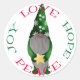 This is a cute sticker for versatile use during the Holiday Season. It features an adorable, bearded gnome dressed in green with a long beard and a snowflake cap. He is holding a gold star. The image is encircled by the text Love Hope Peace Joy in red and green.