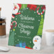 Decorate your Christmas party with this cute green holiday pedestal sign featuring Santa Claus, snowman, presents, candy canes, Christmas trees, ornaments & snowy border frame.