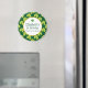 A birthday thank you magnet with a cute repeating pattern with olive green clovers on a dark green background. A white circle with a faux gold foil frame layered over top with your text inside.