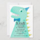 Cute birthday invitation for your child's dinosaur theme party! Cartoon style illustration of a green dinosaur with yellow spikes. The t rex is wearing a blue bow tie and a tiny party hat. You can add the party information on the dinosaur's body. Text is easily editable online.