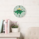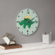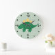 Fun wall clock done in a green checked pattern, with black numbers and dots. Cute cartoon graphics of a green stegosaurus dinosaur decorates the middle of the clock. Great wall decor for any little boy's room, and makes a great gift idea.
