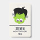 Name badge with an adorable frankenstein monster face. He has big eyes and a little smile with a scar across his forehead. Classic bolts sticking out from the sides of his head. This guy is really cute and not scary at all.