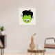 A poster with an adorable frankenstein monster face. He has big eyes and a little smile with a scar across his forehead. Classic bolts sticking out from the sides of his head. This guy is really cute and not scary at all.