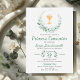 Celebra un hito sagrado con nuestra Encantadora Invitación de Primera Comunión. Decorada con hermosas hojas verdes y un encantador cáliz, esta invitación extiende una cálida bienvenida a niños o niñas, invitando a seres queridos a unirse en este momento especial de la primera comunión.