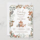 An adorable and cute hand painted watercolor country rustic greenery forest animals woodland baby shower featuring cute bear, deer, racoon, rabbit, hedgehog and a fox in neutral woodlands colour, in orange, green, brown colours. with greenery leaves and tree branches. Perfect gender neutral baby shower invitation for all seasons!