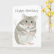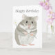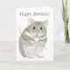 This greetings card features a cute hand drawn grey and white hamster, holding a flower against a white background. The editable front text reads "Happy Birthday". The text inside is fully editable also so you can add your own message should you wish.