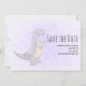 Save the date card with a cute illustration featuring a grayish purple dinosaur.