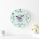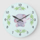 This sweet wall clock has a whimsical grey elephant snuggling a sleeping bunny rabbit in the centre. Pretty floral arrangements accent the animals. The background is pale blue with a darker blue polka dots.