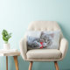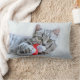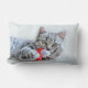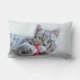 Lumbar pillow with a cute Christmas photograph of a grey tabby cat playfully biting a red santa hat.