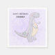 Birthday party paper napkins with a cute illustration featuring a grayish purple dinosaur.