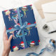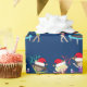 This beautiful gymnastics Christmas wrapping paper features 3 cute gymnast girls wearing Santa hats and holding a pose with ribbons on a pretty blue holiday background. The blonde is holding a red ribbon, the brunette is jumping on a trampoline, and the African American girl is holding a green ribbon.