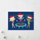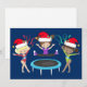 This beautiful gymnastics Christmas card features 3 cute gymnast girls wearing Santa hats and holding a pose with ribbons on a pretty blue holiday background. The blonde is holding a red ribbon, the brunette is jumping on a trampoline, and the African American girl is holding a green ribbon.