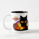 Show off your love for Halloween with this cute two tone coffee mug. This coffee mug features a black cat, pumpkins, and "Halloween trick or treat" text.