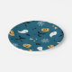 Cute paper plate featuring whimsical Halloween ghosts, pumpkins, spiderwebs and bats against a dark blue backdrop.