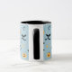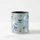 Cute coffee mug featuring whimsical Halloween ghosts, pumpkins, spiderwebs and bats against a gentle blush blue backdrop.