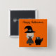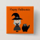 Pretty orange Happy Halloween badge / button with a cute smiling cartoon witch, spider & black cat. Text is customisable by clicking on the “Customise it” button – loads of fonts and colours to choose from.