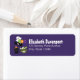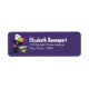 Address labels with a black flying bat, a green mummy bat wearing white bandages and a cute black cat with an orange witches hat. Boo written in fun colourful letters with a happy ghost floating behind. Dark purple background.