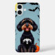 Cartoon-style illustration of a sitting dog with a black and brown coat. The dog has a cheerful expression, with its tongue out and mouth open. In the background, there is a large full moon and several flying bats.
