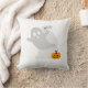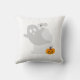This Cute Halloween Ghost Throw Pillow features a Ghost in front of a headstone haunting the graveyard by saying "Boo!" with smiling jack-o-lantern on Halloween